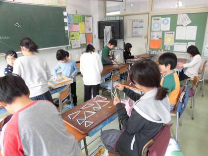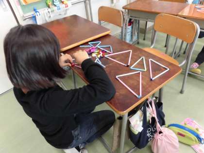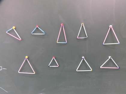 3種類のストローを使っていろいろな組み合わせの三角形を考えるという学習で、みんな楽しんで学習に取り組んでいました。