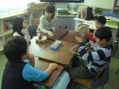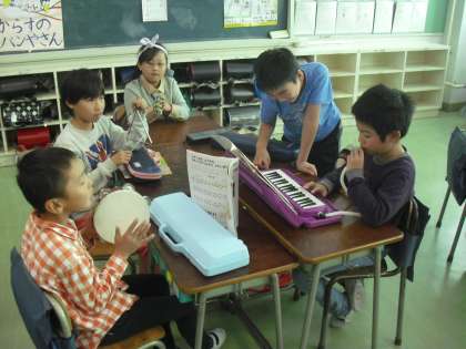 前回の学習から「小ぎつね」を歌ったり、鍵盤ハーモニカで弾いたりしています。今日はさらに、ウッドブロックやトライアングルなどの楽器も取り入れて、グループで演奏の仕方を考えました。曲の雰囲気に合わせて自分のアイデアを生かした演奏をすることができました。