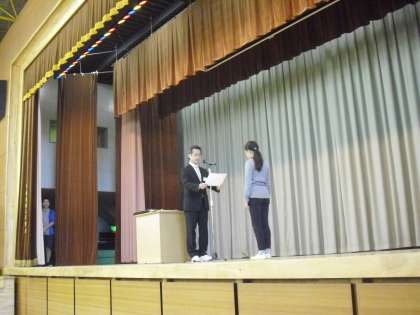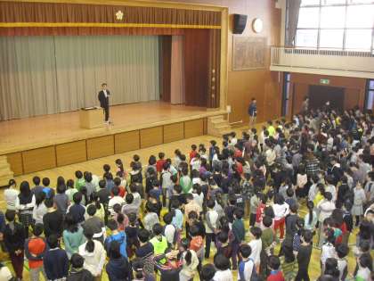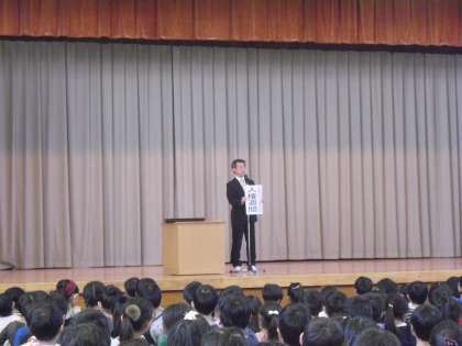 また、「税に関する絵はがきコンクール」で佳作を受賞した子や、空手の選手権大会で三位に入賞した子への表彰がありました。全校のみんなで拍手を送りました。