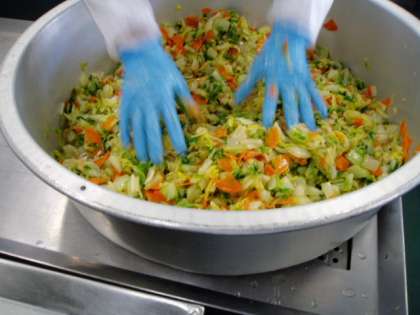しっかり焼いたさばの上から、ごまだれをかけています。練りごま・すりごま・いりごまが入った濃厚なごまだれです。辣白菜(ラーパーツァイ)、白菜の辛甘酢あえができあがりました。旬の白菜の甘みが引き立つ1品です。