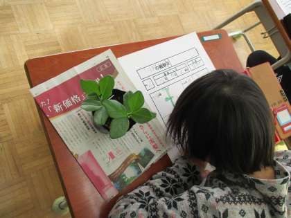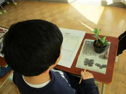 5時間目の生活単元学習の時間、2組では「ソラマメ」の観察をしました。2枚ずつ対になった本葉や茎の様子、本葉からソラマメと同じ匂いがすることなど、たくさんの発見をして観察カードに書きとめることができました。