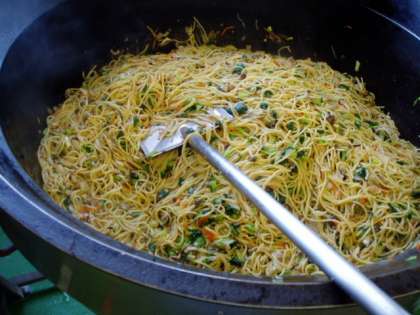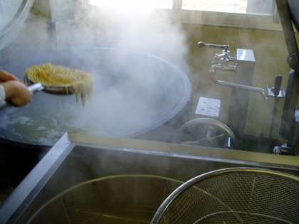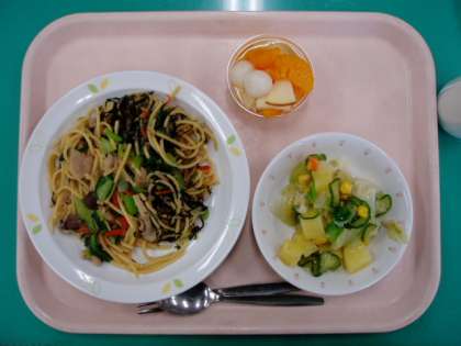 本日は交流給食です。盛り付けがしやすく、人気がある献立にしました。和風スパゲティは小松菜・しめじ・のりなどが入ったしょうゆ味のスパゲティです。固めにゆでたスパゲティに具を混ぜています。