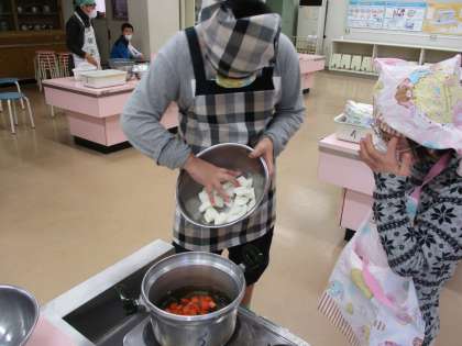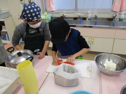 お話会と並行して、1時間目から3時間目を使って、家庭科室で調理学習をしました。今日のメニューは「おでん」です。ボール運動の時と同じ4つのチームに分かれて、野菜を切ったり、おでんの具を切ったりと役割を分担して作りました。「チームで協力!」というスパイスが入っていたようで、とてもおいしい「おでん」ができました。みんなでおいしくいただきました。