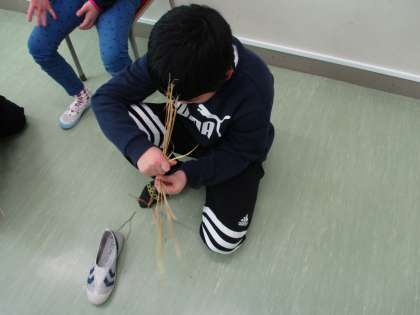 5時間目、5年生は、学年の友達と一緒に「わら細工体験」に参加しました。地域の方々を講師にお迎えして、わらから縄をなう方法を教えていただき、実際に作りました。縄を輪にしてリースを作り、持ち帰りました。日本の伝統的な文化に触れる、貴重な体験ができました。