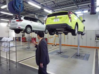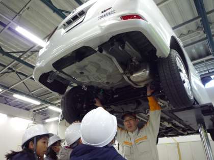 整備場では、車体を下から見たり、エンジンルームを見たりして、普通自動車とハイブリットカーの違いを見学することができました。