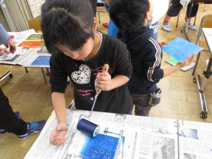 3・4時間目は、図工でスチレン版画をしました。今日は、前回とは違う色の和紙に、インクの色や原版のレイアウトも変えて印刷してみました。インクが乾くのを待ってから、一人ずつ順番に発表し、互いの作品に拍手を送り合いました。