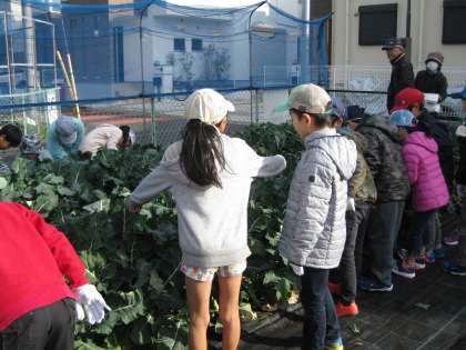 今日は農業体験で高橋農園に行きました。9月にブロッコリーの苗を植えて、今日はいよいよ収穫の日です。みんなとても楽しみにしていました。高橋さんが説明してくださいましたが、今年は11月に雪が降り、気温が低かったために生育があまりよくなかったようです。少し小さなブロッコリーでしたが、一人2ついただきました。とても小さい子にはラディッシュをくださいました。学校に戻ってから、何の料理に入れてもらおうか、友達とうれしそうに話す姿が見られました。明日、感想を聞いてみたいと思います。