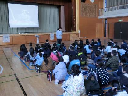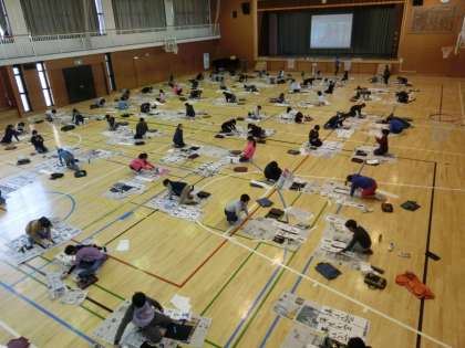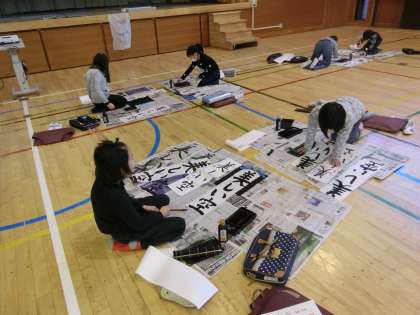 4年生の課題は「美しい空」です。体育館のスクリーンに映し出された映像で、書き初めのめあて「文字の中心、画と画の間を意識して書く」を確認して取り組みました。1、2校時でとても寒い体育館でしたが、子どもたちは集中して真剣に筆を運んでいました。