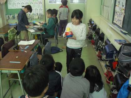 2組では明日3校時の発表会へ向けて、子どもたち同士で発表練習をしました。相手を見て話したり、思い出の品物を実際に提示するタイミングを考えたりしながら、お互いの発表をよりよくしようとアドバイスしていました。