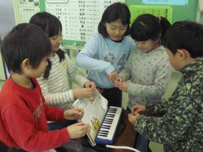 音楽科では「日本のうたを楽しもう」の学習で、「ずいずいずっころばし」や「あんたがたどこさ」を歌ったり手遊びを楽しんだりしました。わらべ歌に親しみながら、日本の歌曲の特徴やよさを味わっています。