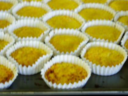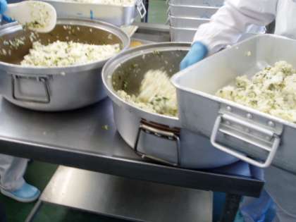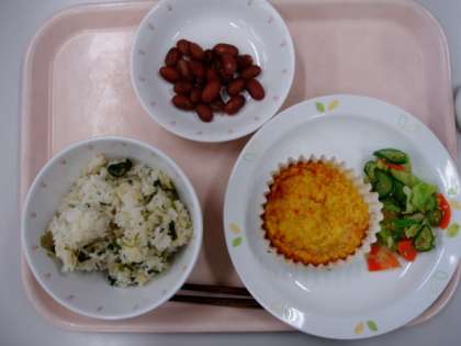 濃いめにしょうゆ味に炒めた小松菜をご飯にしっかり混ぜて、菜めしをつくっています。たまご焼きには、ぶたひき肉・野菜のみじん切りも混ぜてオーブンでしっかり焼いています。やさしい甘辛味が子どもたちに人気がある一品です。