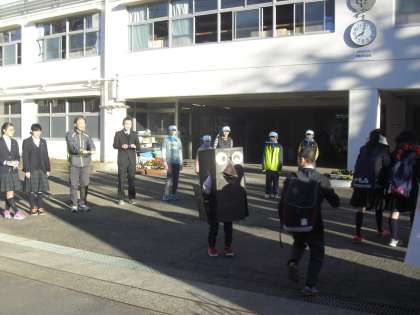 烏山地域あいさつキャンペーン2日目。今日は代表委員会とカラス君が、温知学舎の上祖師谷中学校でのあいさつ運動に取り組みました。