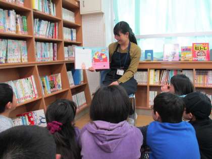 2校時目は図書の時間でした。図書委員の仕事をしてもらい、借りている本を返し、新たに2冊の本を借りました。図書館には季節に合った読んで欲しい本が、手に取りやすいように展示してあるので、子どもたちは思い思いの本を手に取り借りていました。また、司書の方による絵本の読み聞かせがあり、「きゃあああああああクモだ!」というわくわくする本を読んでいただきました。とても面白かったようで、さっそく、身近にもクモの巣はないか、クモの巣を捜していました。