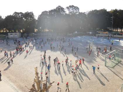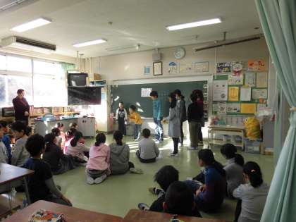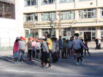 今日も快晴。寒さを感じさせないほど元気いっぱいに校庭で「ねことねずみ」や「氷おに」、中遊びの班は「ジェスチャーゲーム」や「なんでもバスケット」で遊びました。