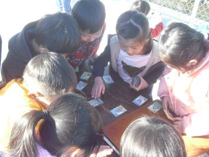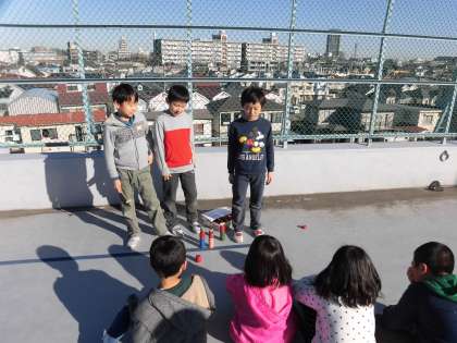 2年生の生活科「1年生に昔の遊びを教えよう」の一環で、1年生を屋上に招待して剣玉やおはじきなど、昔から伝わる遊びを1・2年生が一緒に楽しみました。