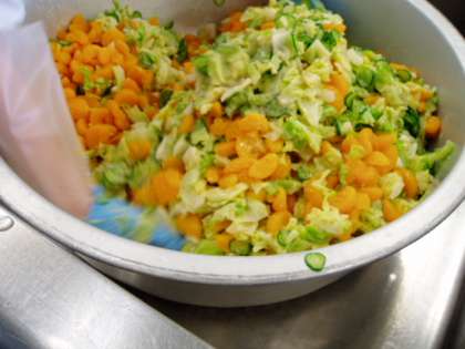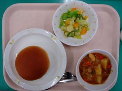 本日のミルクパンは今朝焼きたてのパンです。焼きたてのフワフワとした食感がおいしいミルクパンです。みかん入りのフレンチサラダをあえています。すりりんごを入れたドレッシングは酸味がやさしくなるので、子どもたちにも人気があります。
