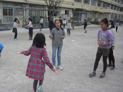 縄跳び旬間中の朝は異学年で短縄跳びに取り組む「ジャンピングタイム」が行われています。金曜日は2年生と5年生が校庭に出て、縄跳びに取り組みました。5年生が2年生に教えてあげたり、5年生の技を見て2年生が拍手をしたりする場面が見られました。子どもたちが積極的にかかわり合いながら、短縄跳びを楽しんでいます。