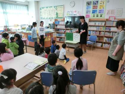 前半は「おはなし会」として、図書館司書による本の読み聞かせを行いました。大型絵本を使った動物が出てくるお話に聴き入っていました。