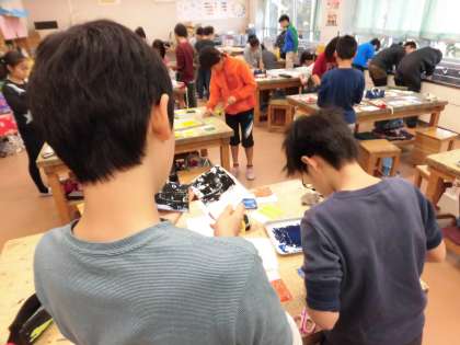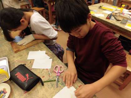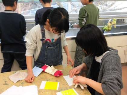 5年生は図画工作科の学習で、木版画に取り組んでいます。「ほっては刷り、刷ってはほる。」を繰り返し、色の組み合わせや模様の重なりを楽しんでいます。