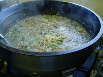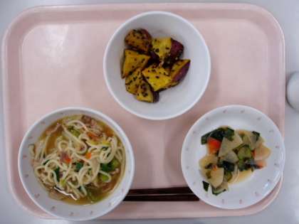 野菜がたっぷり入ったタンメンができました。鶏がらスープと野菜のうま味で塩分控えめでも、おいしく食べられます。タレから手作りをした大学芋も完成です。素揚げしたさつまいものパリパリの食感も楽しめます。