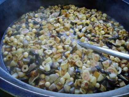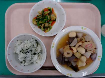 本日は2年2組のふれあい給食です。2年2組のみなさんのリクエストから、おでんに決定しました。こんぶとかつお節のだしをたっぷり使い、じっくり煮込みました。最後に入れるうずら卵は別の釜で煮込んで味が薄くならないようにしています。