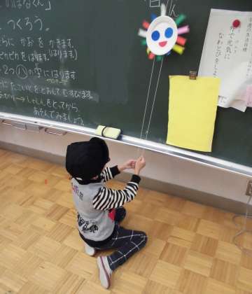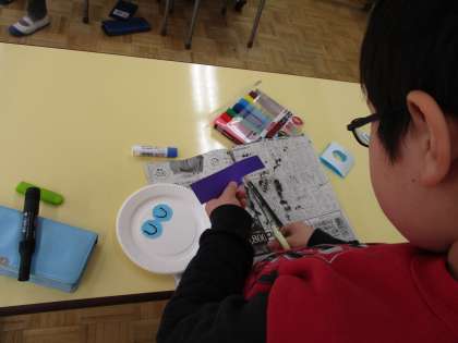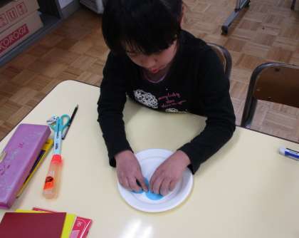 2・3時間目に、図工をしました。今日は「作ってあそぼう」という単元で、紙皿を使って「お日さまのぼるくん」という動くおもちゃ作りに取り組みました。紙皿を顔に見立てて目・鼻・口などを描き、顔の周りにお日さまのピカピカを貼り付け、裏側にストローを貼って、タコ糸を通したらでき上がりです。ひもを引いて、お日さまを上下に動かして楽しみました。ストローにタコ糸を通すところが難しかったのですが、どの子も自分で通すことができました。