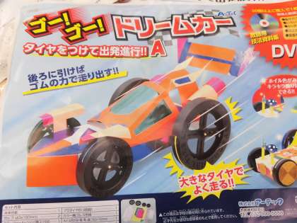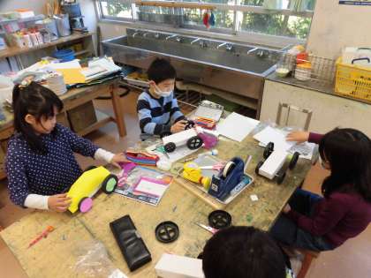 今、図画工作科では「タイヤをつけて出発進行」という学習をしていて、輪ゴムの力を利用して進む車作りをしています。