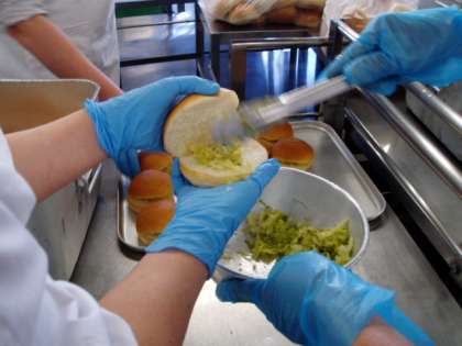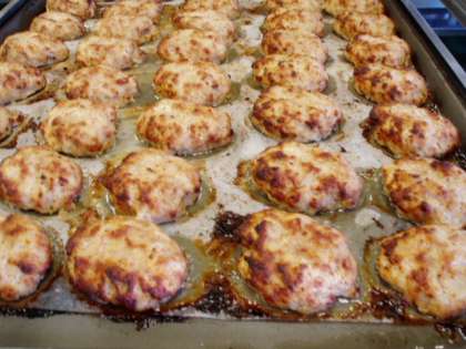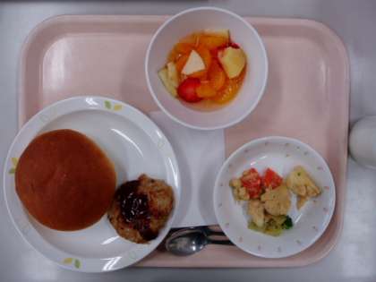 パン1つずつ丁寧に切れ目を入れて、キャベツソテーをはさんでいます。低・中・高と大きさを変えたハンバーグが焼きあがりました。たっぷりソースをかけたハンバーグを自分でパンにはさみ、いただきます。