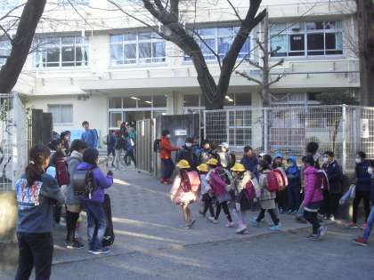正門では6年生が朝のあいさつを呼びかける日でした。6年生が校門前に並ぼうとすると、すでにその場にはあいさつ運動に飛び入り参加する1・2年生の姿がありました。自らすすんであいさつをしようとする気持ちが行動となって表れていました。所せましと正門からピロティに並ぶ1・2・6年生から、「おはようございます!」と元気な声が聞かれました。