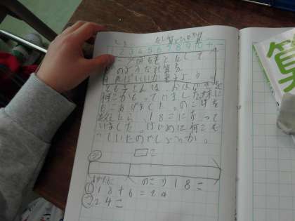 子どもたちはテープ図を使って、この場面をしっかりと理解し、立式することができていました。