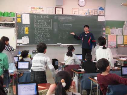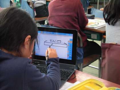 「テープ図をもとにして、どのような計算をすればよいか考えよう」というめあてを確認した後、タブレット型端末を使って考えました。