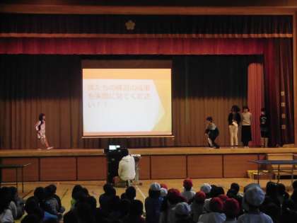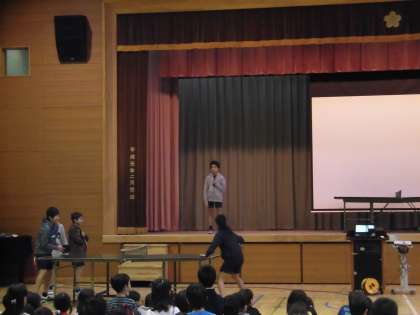 クラブごとに、練習の様子や、1年間経験し、積み上げた成果を全校の前で発表しました。