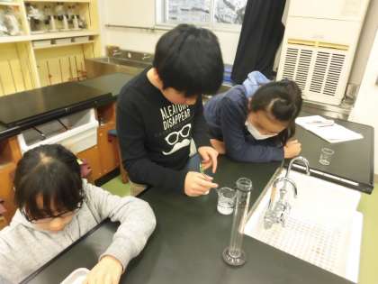 決まった水の量にとける食塩やミョウバンの量には限りがあるのかという課題を解決するために実験をしました。メスシリンダーを使っての水の量り方、すりきり1ぱいの取り方もしっかりと確認しました。