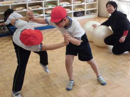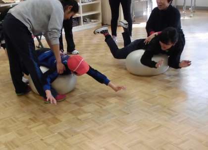 5時間目に体育の学習をしました。1月に続き、今回も作業療法士の先生にご指導いただきました。今日は、バランスボールを使って、「腹這いの姿勢でバランスをとる」という運動をしました。始めに「押し相撲」「平均台歩き」等、別の運動をしてから、バランスボールに乗ると、運動をしない時よりも上手にバランスがとれるということを体感しました。「体のバランス」という普段はあまり意識しないことに気付き、体を動かす楽しさを味わうことができました。