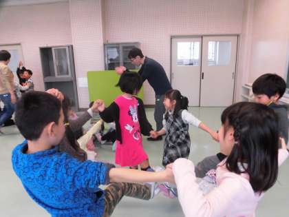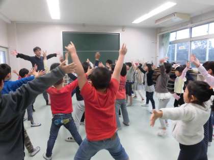 体全体を使って、グー・チョキ・パーのじゃんけんや、太陽・風・雲のじゃんけんをしました。子どもたちのアイディアでポーズを決めながら行い、大盛り上がりでした。