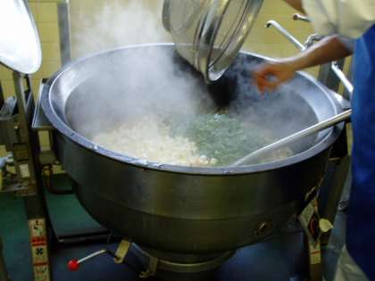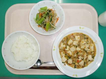 にんじん・大豆・しいたけなどがみじん切りされて入っているあんに、しっかりゆでた豆腐を混ぜて麻婆豆腐ができあがります。青菜のじゃこあえは、炒ったちりめんじゃこのうま味でおいしく青菜が食べられます。