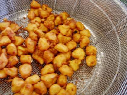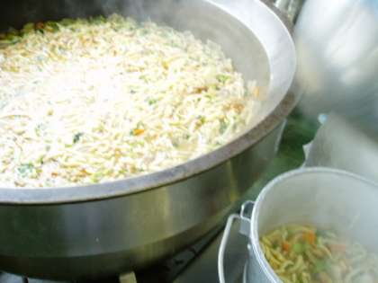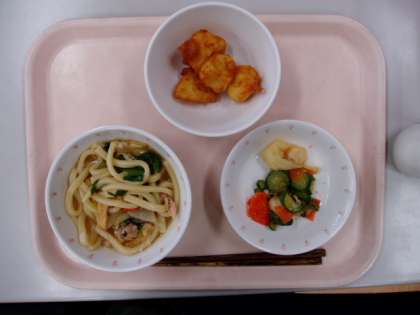 ポテトドックはじゃがいもをやわらかく蒸してから、小麦粉と砂糖などが入った甘い衣をつけて揚げた人気がある献立です。具だくさんのけんちんうどんも完成し、配缶しています。