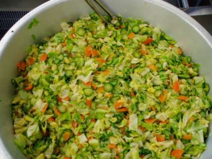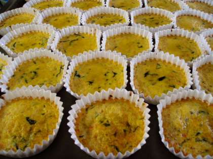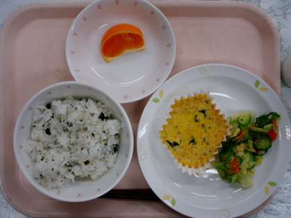 にんじん・たけのこ・こまつな・ぶた肉などが入った具だくさんな卵焼きが焼き上がりました。給食室で煎ったごまの香りが食欲を増す、野菜のごま風味も完成です。