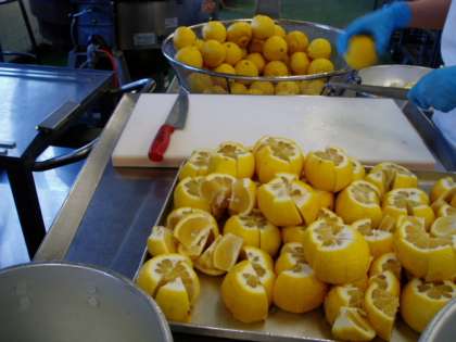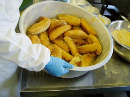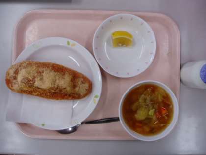 本日は人気献立、揚げパンです。揚げたコッペパンをタライに入れて、きなこをまぶしています。今日のくだものは「はるか」です。黄色いので酸味が強そうに見えますが、とても甘いくだものです。