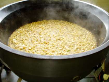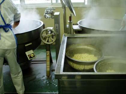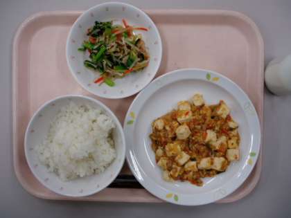 本日は定番の献立、麻婆豆腐です。にんじんや筍など、たくさんの食材がみじん切りにされて麻婆のあんに入っています。しっかりゆでた豆腐を、あんに混ぜてできあがりです。