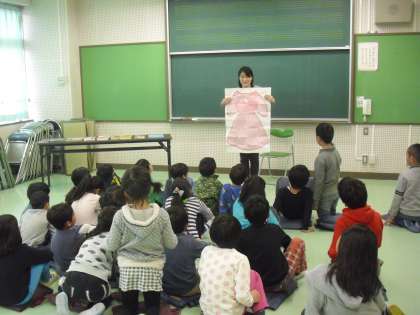 2年生として最後のおはなし会では絵本の読み聞かせに手遊び歌などを交えていただき、子どもたちは楽しいひとときを過ごすことができました。会の終わりには、心を込めて「ありがとうございました。」とお礼を言いました。