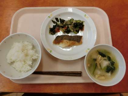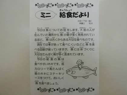 今日の給食の魚は食べやすい“ホキ”です。低カロリーで高たんぱく質の“ホキ”にステーキソースをつけて、おいしく魚を食べましょう。