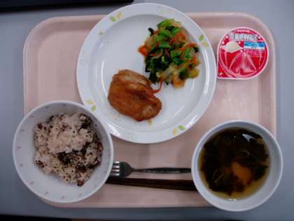 本日は進級・進学のお祝いに赤飯を炊きました。タレに漬けて焼いた、とり肉のごまだれ焼きも香ばしく焼けました。子どもたちが楽しみにしていたデザートは、雪見だいふくです。本日で今年度の給食は終了になります。本校の学校給食にご理解いただき、ありがとうございました。