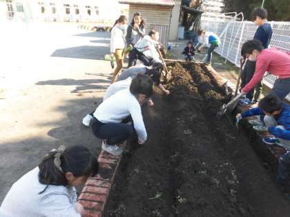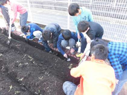 今日はみんなで学年園に畝を作り、ジャガイモを植えました。ジャガイモは6年生になってから理科の学習で使います。生長するまでじっくり観察していきたいと思います。
