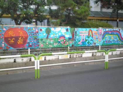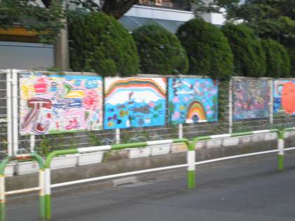 サマースクールの絵を学校のフェンスのところへ掲示しました。