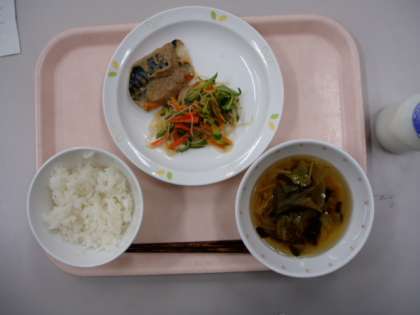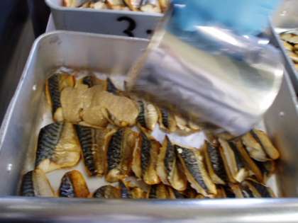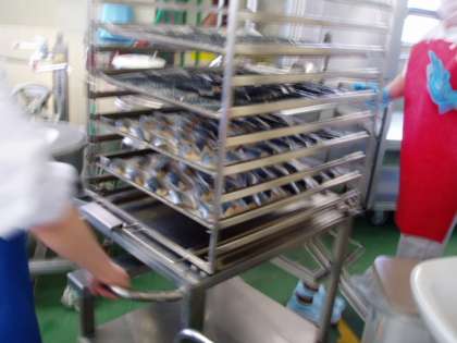 魚のごまだれかけの調理の様子です。生魚担当(赤エプロン)から調理担当(青エプロン)に魚を受け取り、オーブンでしっかり焼きます。焼き上がった魚を各学級に分け、ごまをたっぷり使ったごまだれをかけます。
