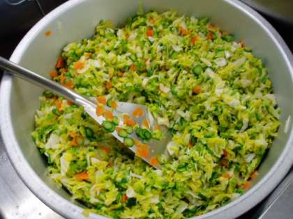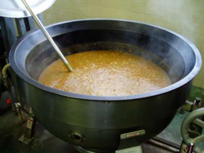 本日の献立は子どもたちに大人気のカレーライスです。野菜ととり肉をスープで煮て、手作りカレールーを加え、じっくり煮込みました。から炒りした塩としょうがで味をつけた、ひと塩野菜もできあがりです。