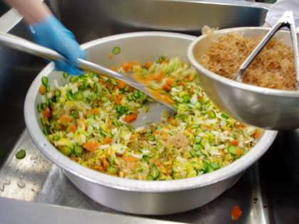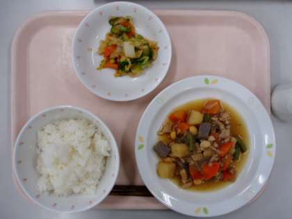にんじんやじゃがいも・大豆などが入った、具だくさんの筑前煮ができました。給食室の釜でじっくり蒸し煮にしましたので、れんこんなどの根菜もふっくらとした食感になりました。から炒りをしたけずり節を白菜に混ぜて、おかかかけもできあがります。