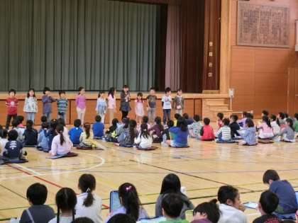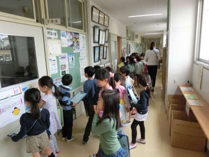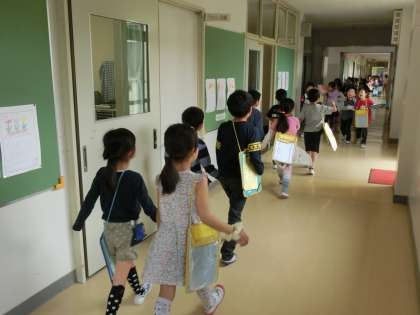 烏山小学校での生活にも慣れてきた1年生ですが、校内にはまだ足を運んだことのない教室も多くあります。そこで1年先輩である2年生が案内役となり、一緒に学校を回りました。事前の顔合わせで仲よくなった1年生と2年生は、体育館から手をつないで出発しました。2年生の説明を真剣なまなざしで聞く1年生と、お兄さん、お姉さんとして1年生をリードする2年生。とても有意義な学習ができました。