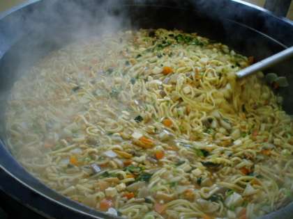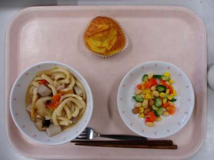 昨日から楽しみにしていたという声も聞こえてきたキャロットケーキが焼きあがりました。ゆでたにんじんをミキサーでペースト状にし、ケーキ生地に混ぜました。にんじんのクセが少なく、やさしい甘味がおいしいケーキです。野菜がたっぷり入り、具材のうま味がおいしいけんちんうどんもできあがりです。